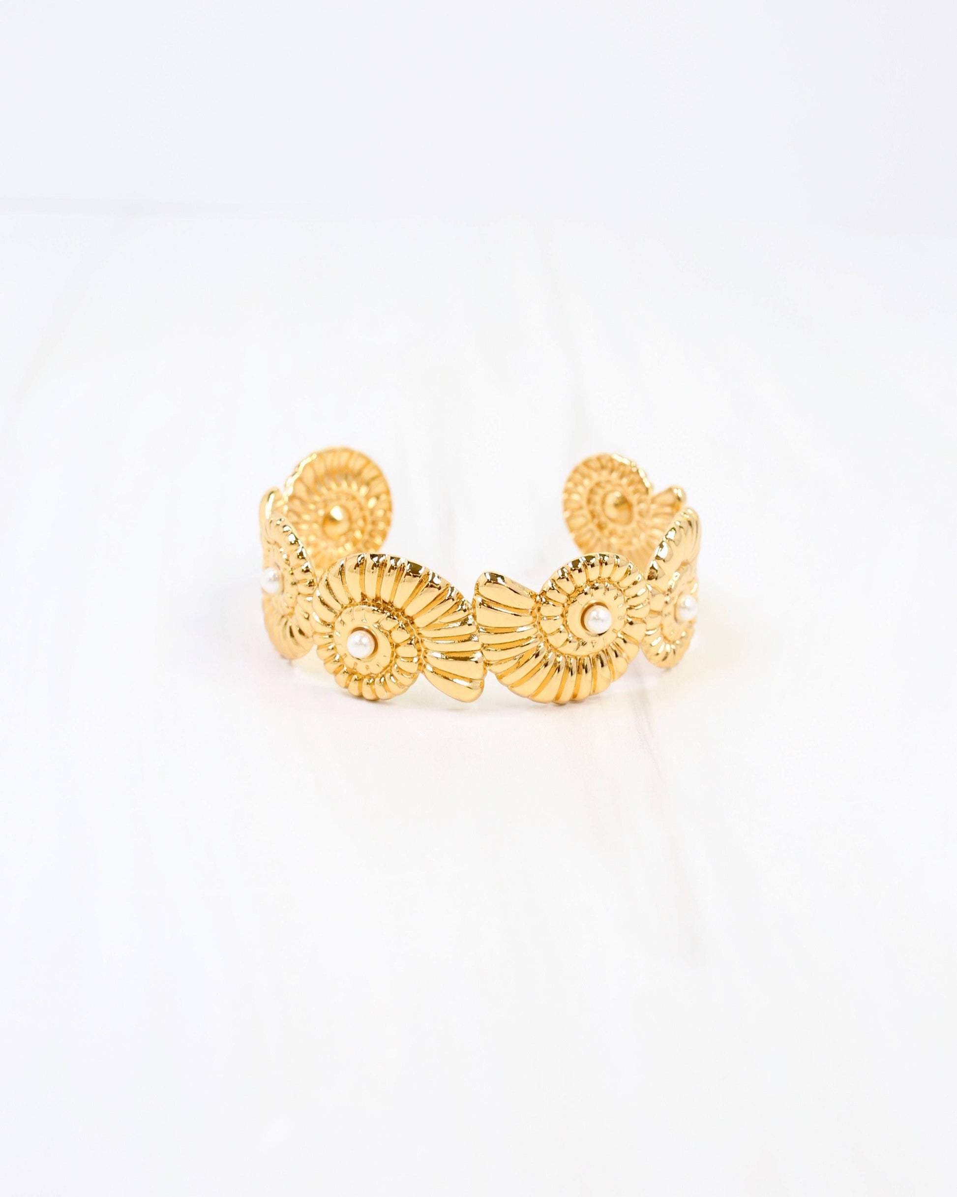 Elegant gold bracelet featuring delicate shell detailing. This versatile piece brings coastal-inspired sophistication to any look, perfect for everyday wear or special occasions.